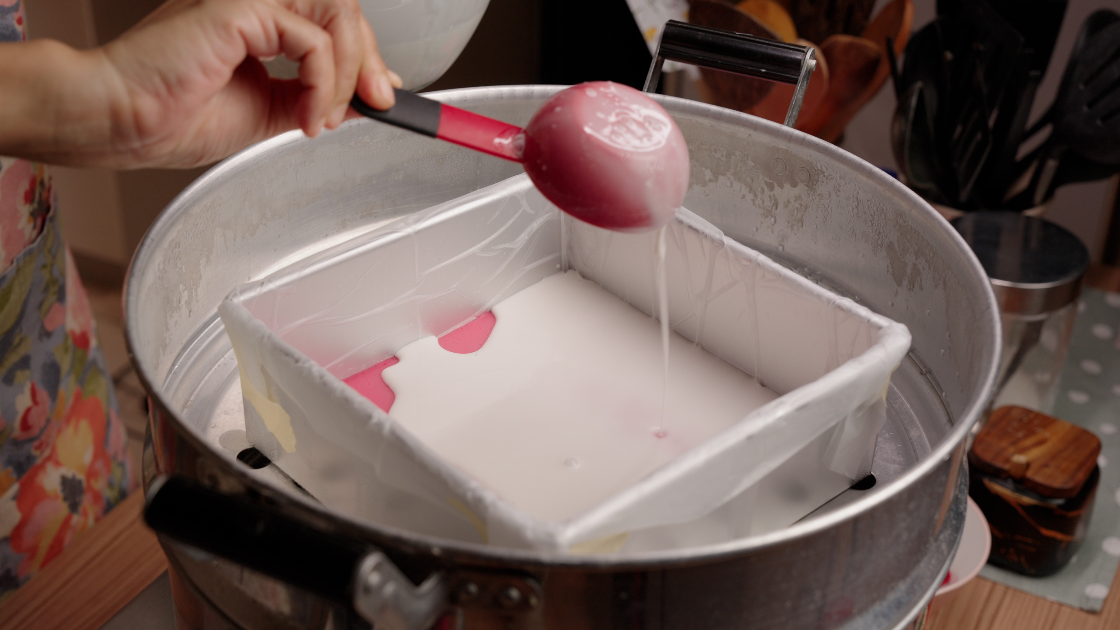 Plastik tahan panas mesti dipasang kemas dan tegang dalam loyang. Kalau berkedut, kesan lipatan akan melekat pada lapisan bawah kuih dan nampak tak cantik bila dipotong.