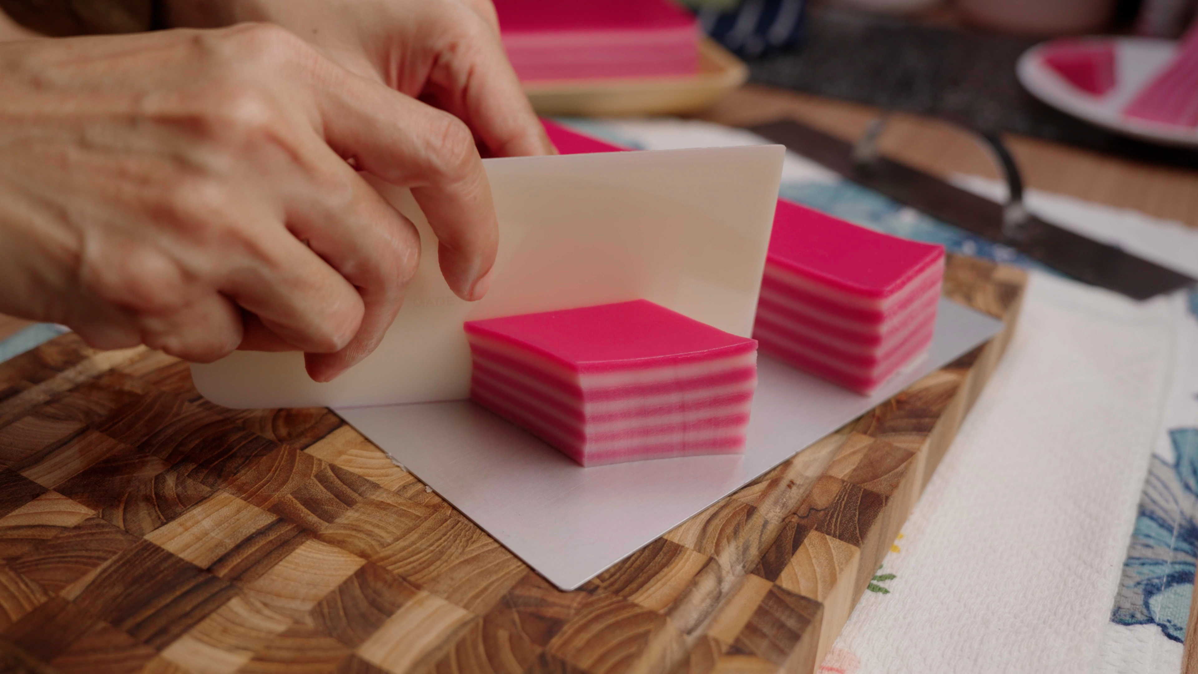 Che Nom sarankan pisau plastik yang disapu sedikit minyak. Pisau besi mudah melekat dan tarik lapisan kuih. Pisau plastik beri potongan lebih licin dan kemas.