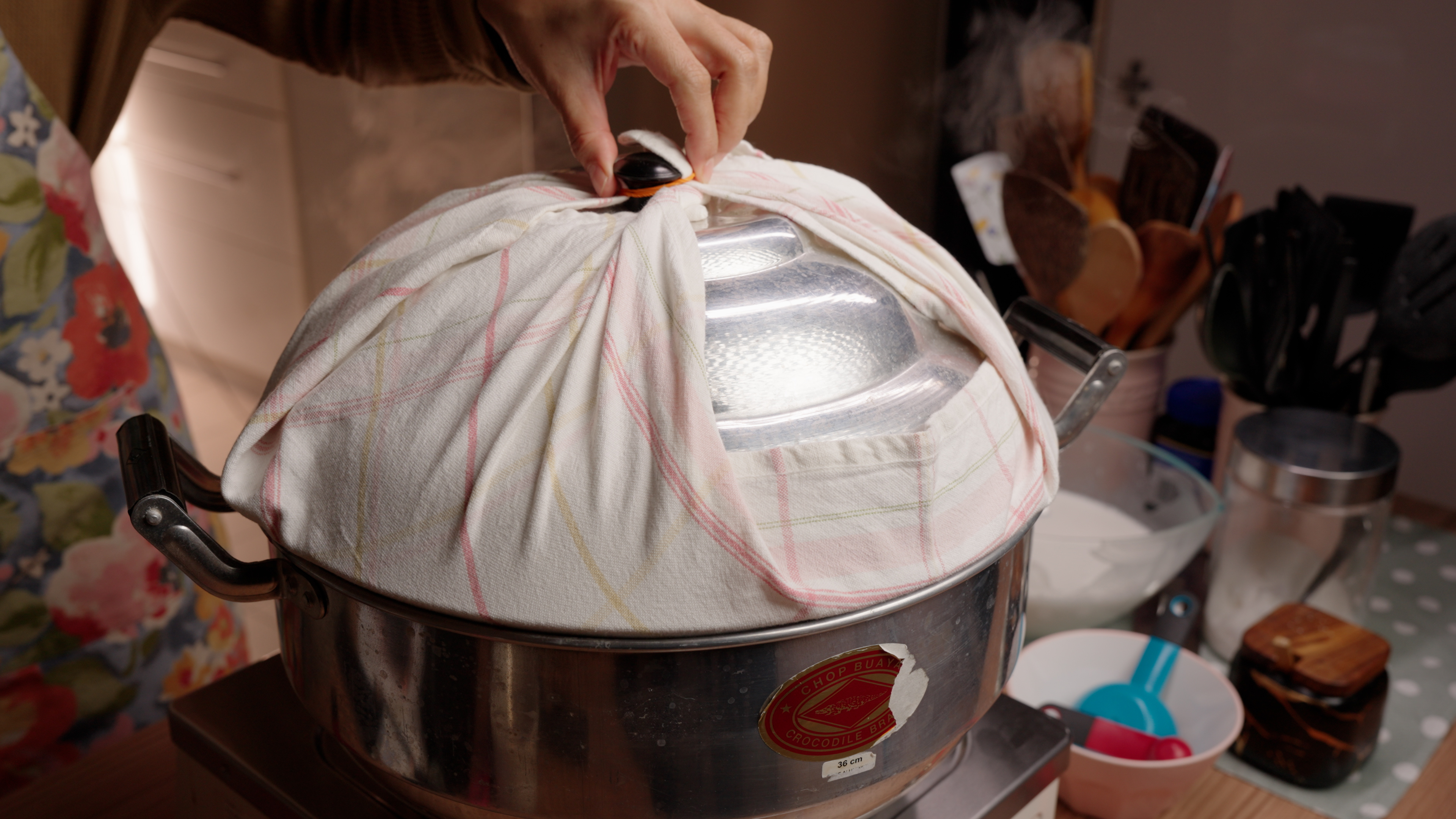 Penutup pengukus WAJIB dibalut kain. Kalau tidak, wap air akan berkumpul dan menitis atas kuih, menyebabkan permukaan berlubang.