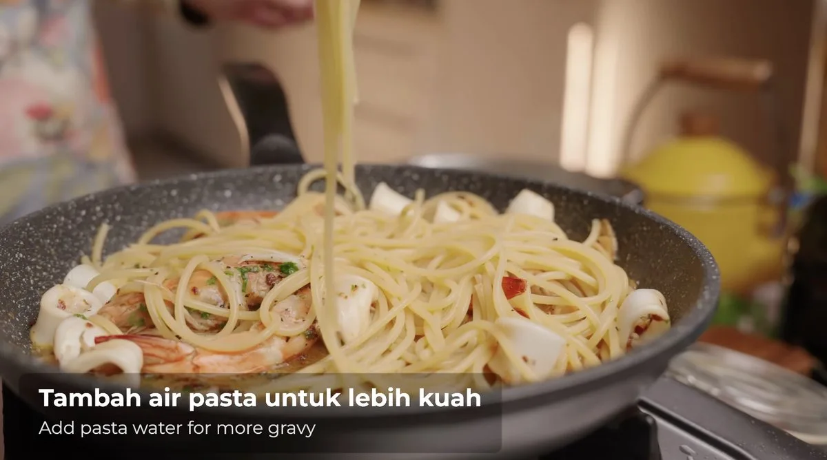 Dalam aglio olio, kuah cantik bukan datang dari banyak sos — tapi dari minyak + air rebusan + tossing.