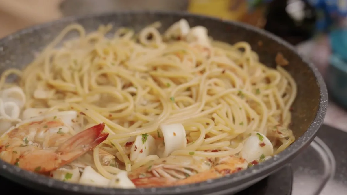 Untuk versi lengkap dengan sukatan dan langkah memasak penuh, sila rujuk resipi Spaghetti Aglio Olio dengan Seafood di sini: https://resepichenom.com/resepi/spaghetti-aglio-olio-dengan-seafood