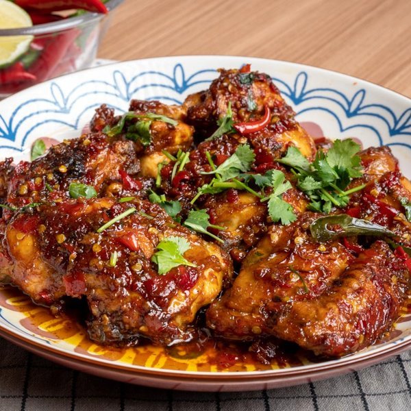 Ayam goreng garing disalut sambal pedas beraroma yang seimbang rasa masam, manis, dan wangi daun limau purut.
