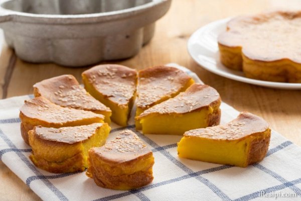 - 4Tuang bancuhan ke dalam acuan yang sudah digris dengan minyak, tabur permukaan atas dengan bijan dan bakar selama 20-25 minit, atau sehingga bahagian atas kuih masak keperangan.