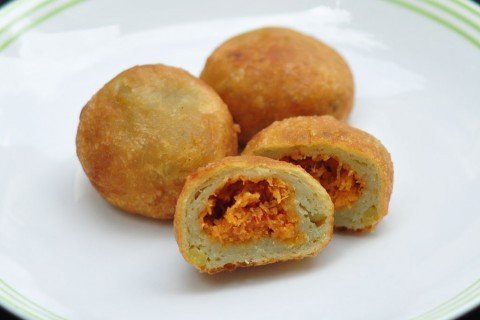 - 4Gaulkan ubi keledek dengan tepung hingga sebati, kemudian bentukkan bulat2