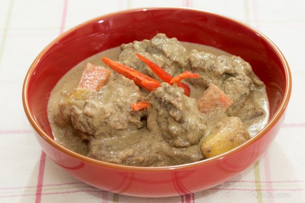 - 4Apabila daging sudah lembut, masukkan santan, air asam jawa, karot, kentang, cili hijau dan bawang besar. Masak sehingga bahan tadi empuk.