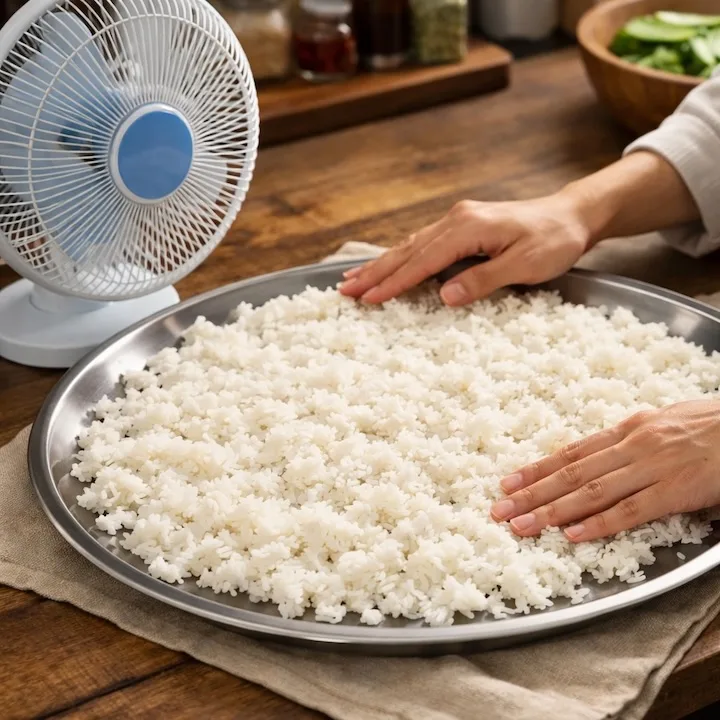 Ratakan nasi atas dulang atau pinggan besar, biarkan 20–30 minit supaya wap keluar. Lagi cepat kalau dekat kipas.